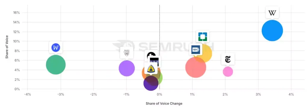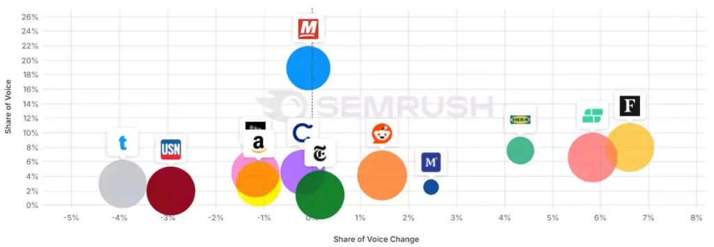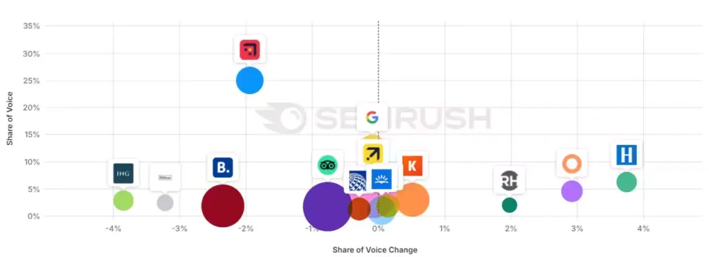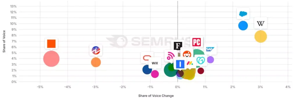 Заглиблюючись у набір з майже 10 000 ключових слів, які ми відстежуємо у Semrush Enterprise Suite, ми можемо побачити зміни в деяких вертикалях за останні 12 місяців.
