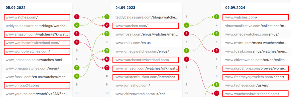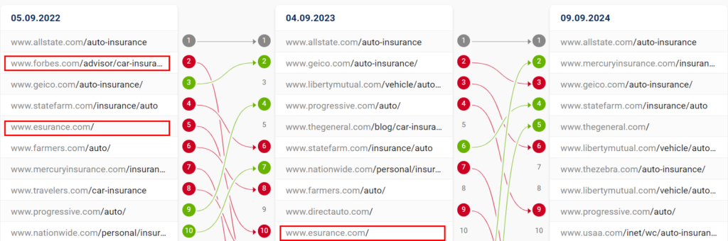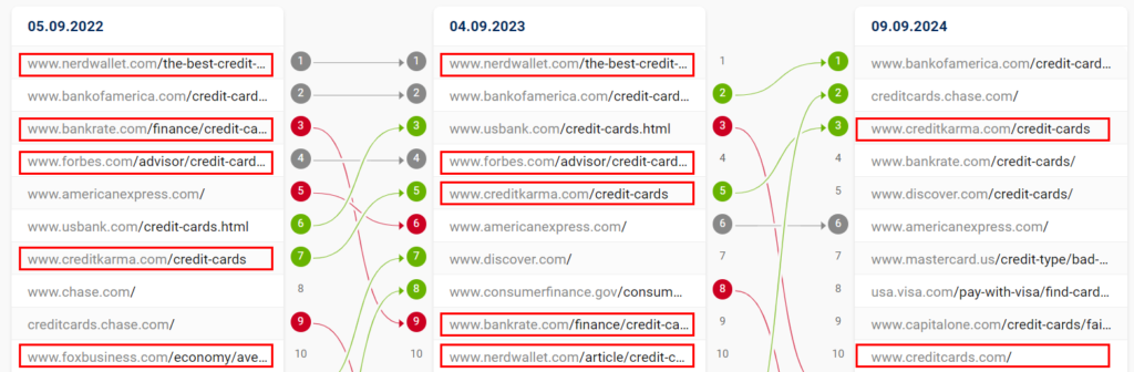 Крім того, три зразкові, гіперконкурентні ключові слова показують значні зміни в складі результатів SERP за останні два роки (не бренди виділено червоним).