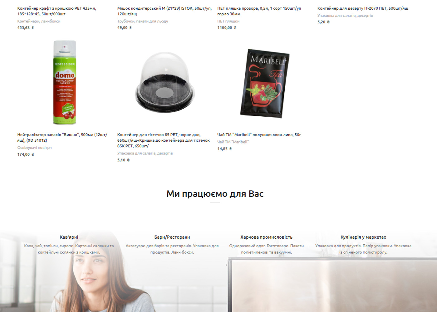 Її клієнтами є ресторани, бари, кав’ярні, супермаркети, магазини, виробництва, офіси, медичні заклади та представники б’юті-індустрії. Асортимент продукції включає аксесуари, паперову гігієнічну продукцію, побутову хімію, картонні стакани та кришки, коктейльні стакани з кришками, каву, чай, цукор, спеції, одноразовий одяг, господарські та інші товари.