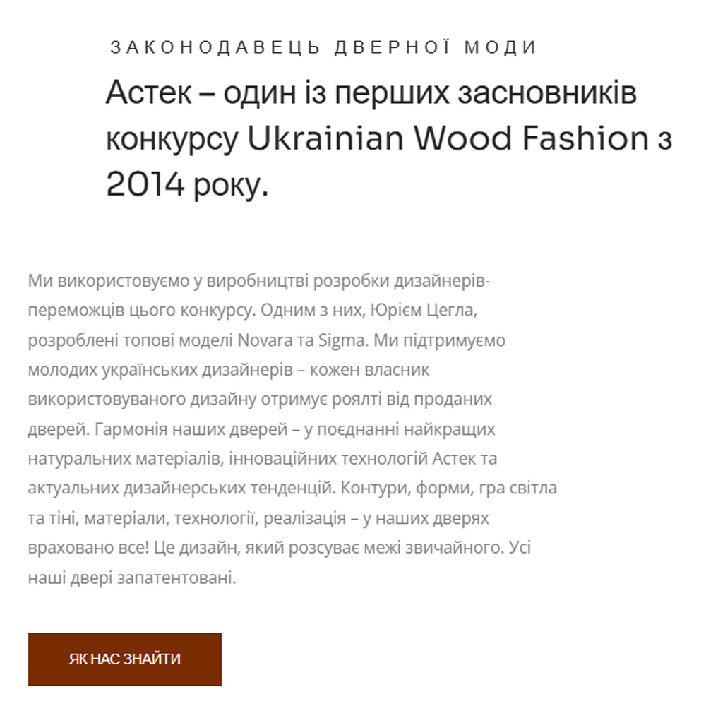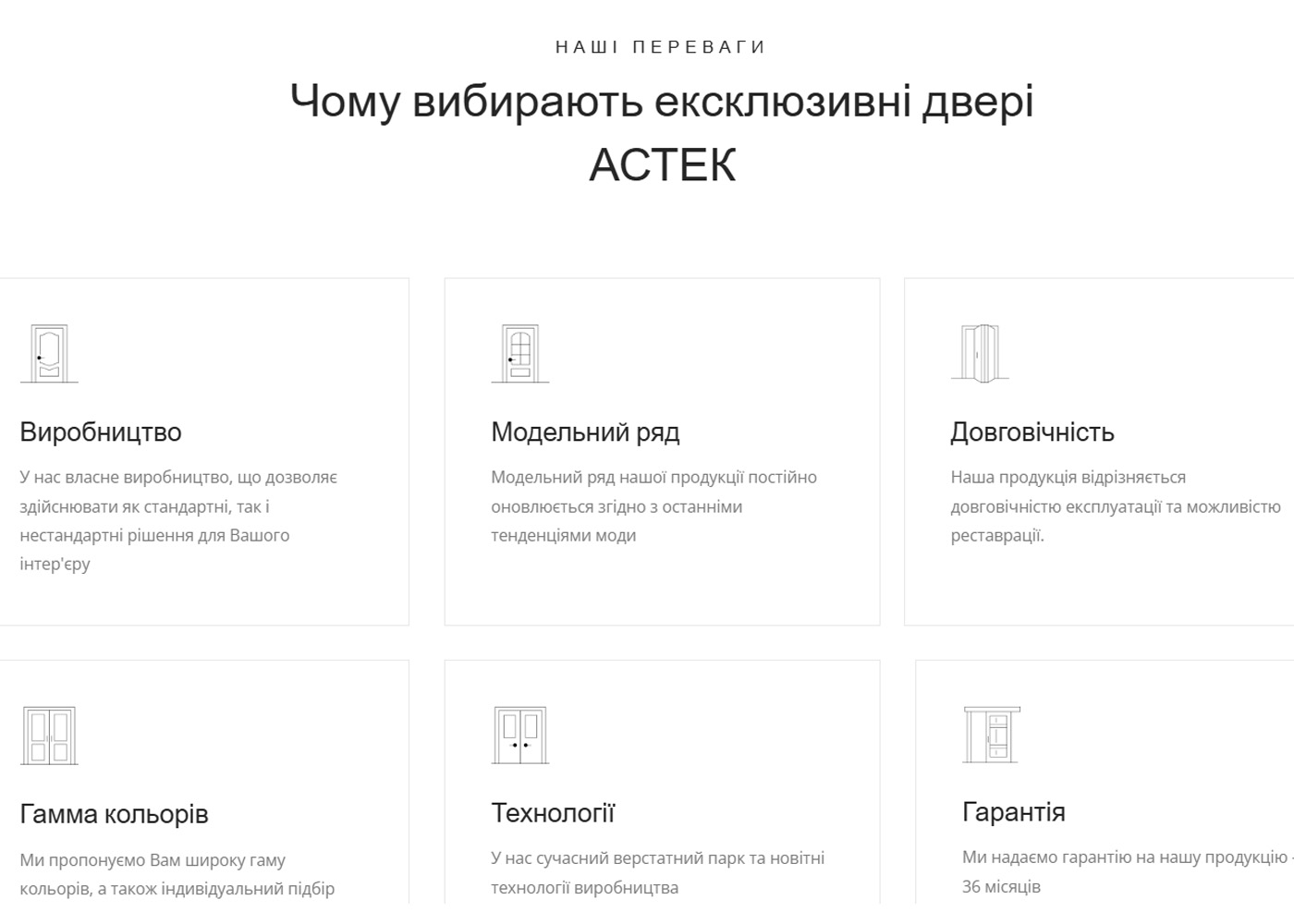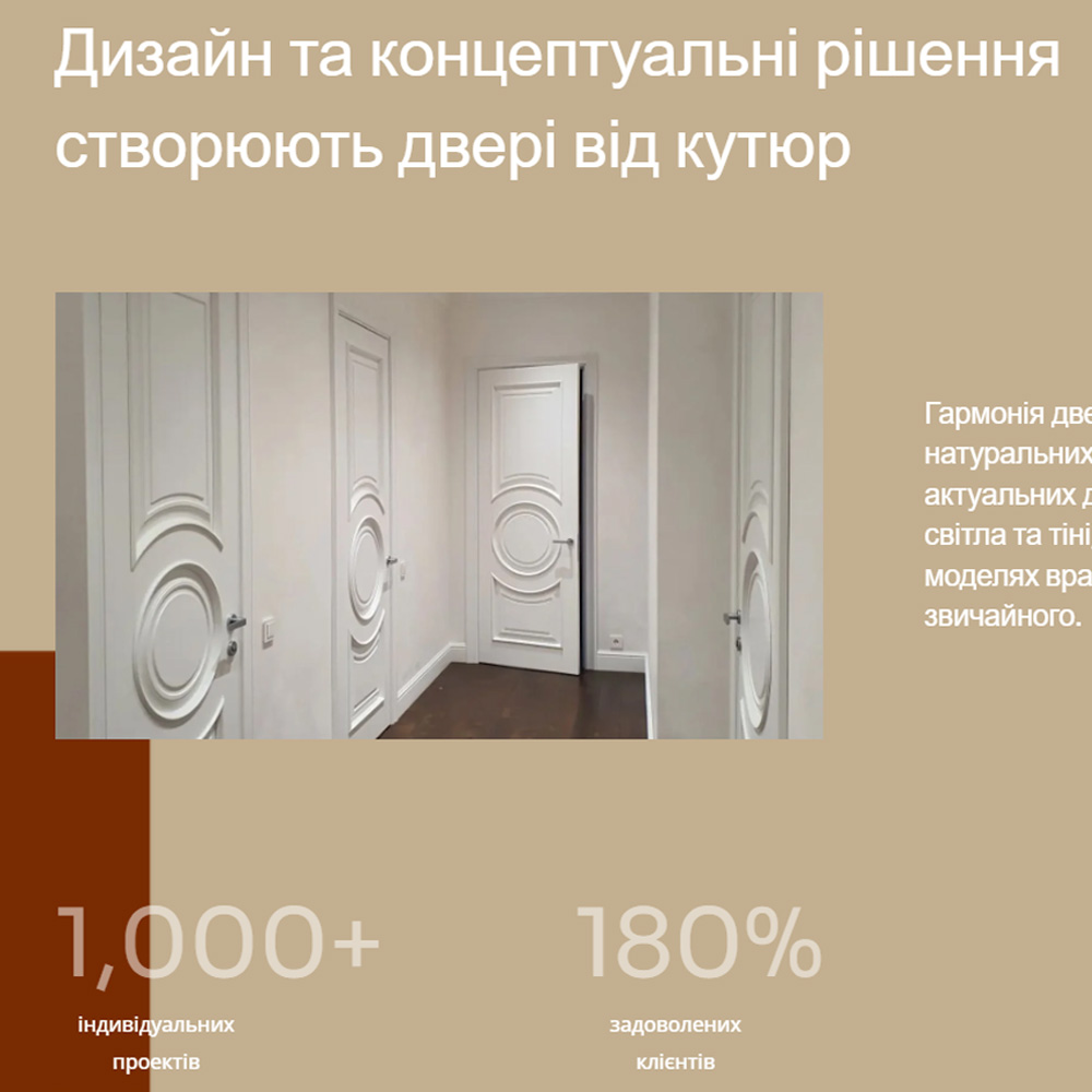 Створено односторінковий веб-сайт з інтуїтивно зрозумілою структурою, який містить розділи: “Головна”, “Продукція”, “Послуги”, “Про нас” та “Контакти”. У розділі “Продукція” представлено детальний каталог дверей з описами та характеристиками, що дозволяє клієнтам ознайомитися з асортиментом та обрати необхідний продукт. В інформації про компанію розміщено основні напрямки діяльності компанії та її переваги. Сайт також містить форму зворотного зв’язку для зручного спілкування з клієнтами. Ресурс представлений українською мовою.