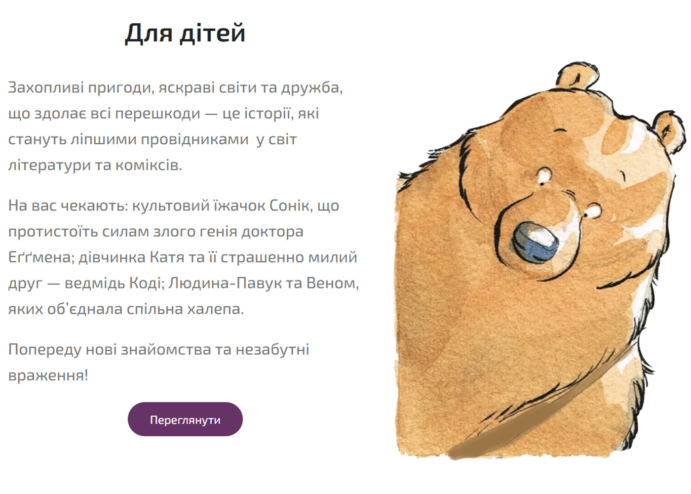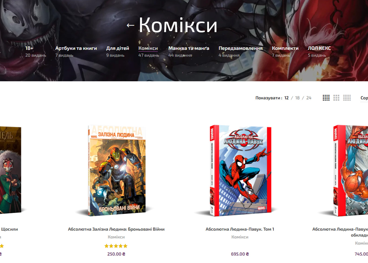 Створено інтернет-магазин зі зрозумілою навігацією, який містить розділи: “Головна”, “Наші видання” (з підрозділами “Передзамовлення”, “Манхва та манґа”, “Комікси”, “Артбуки та книги”), “Оплата й доставлення”, “Бонус +” та “Контакти”. У розділі “Наші видання” представлено детальний каталог продукції з описами, технічними характеристиками та фотографіями, що дозволяє клієнтам ознайомитися з асортиментом та обрати необхідний товар. Сайт також містить інформацію про умови оплати та доставки, а також програму лояльності “Бонус +”, що забезпечує зручний зв’язок з клієнтами. Ресурс представлений українською мовою.