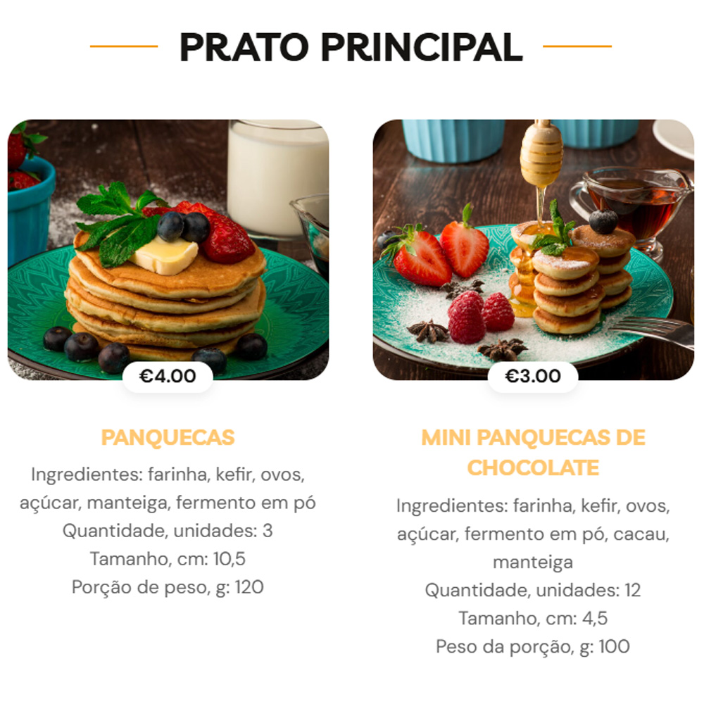 Створено односторінковий веб-сайт з інтуїтивно зрозумілою навігацією, який містить розділи: “Головна”, “Про нас”, “Продукція” та “Контакти”. У розділі “Продукція” представлено асортимент млинців, крепів та вафель з детальними описами та фотографіями, що дозволяє клієнтам ознайомитися з пропозицією компанії. Сайт також містить інформацію про місцезнаходження пекарні та години роботи, що забезпечує зручний зв’язок з клієнтами. Ресурс представлений португальською мовою, що робить його доступним для місцевої аудиторії.